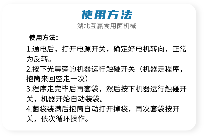 近年來代料香菇裝袋機(jī)的發(fā)展,越來越迅猛。其規(guī)模不斷擴(kuò)大,品種不斷增多,地域限制越來越少。是農(nóng)民增收的可靠保障,也是地方政府的經(jīng)濟(jì)支柱。自動(dòng)套袋食用菌裝袋機(jī)廣泛用在香菇、木耳、平菇、金針菇、茯苓、灰樹花、姬菇、秀珍菇等食用菌種植領(lǐng)域。是工廠、基地、合作社、家庭農(nóng)場(chǎng)理想的工廠化生產(chǎn)機(jī)械。生產(chǎn)規(guī)模的大小可根據(jù)資金、銷售量、經(jīng)營方式、技術(shù)力量、資源條件等綜合因素來確定,可用單機(jī),也可組合設(shè)計(jì)成半機(jī)械化...