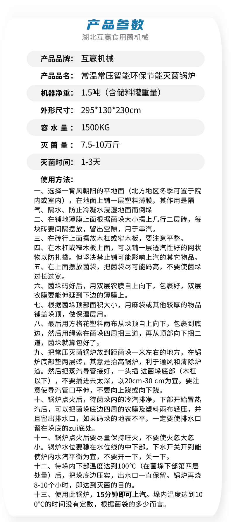 食用菌生產(chǎn)機(jī)械化技術(shù)的主要內(nèi)容是以樹枝、修剪條、鋸木屑和刨花、玉米芯、玉米稈、麥秸、稻草、花生殼、棉籽殼等為主要原料,經(jīng)機(jī)械加工成碎屑狀,添加一定的輔助材料,如麥麩、米糠、豆餅、花生餅、蔗糖、石膏、碳酸鈣、硫酸鎂等,經(jīng)機(jī)械制種、制袋、滅菌、接種、栽培、采收、加工,形成一整套機(jī)械化生產(chǎn)和栽培的技術(shù)規(guī)范。 食用菌常壓滅菌爐滅菌工藝。滅菌工藝一般分高壓滅菌和常壓滅菌。高壓滅菌主要用于制作母種、原種...